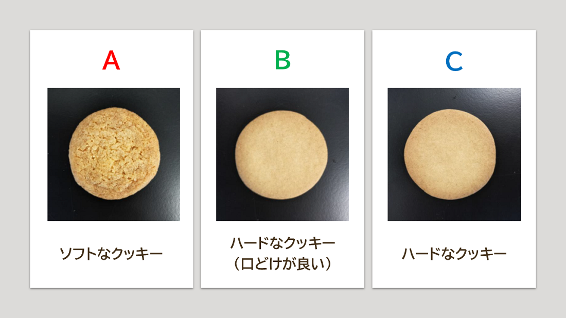 - B:サクサクしたハードなクッキー(当社でん粉素材を利用した口どけの良い食感)