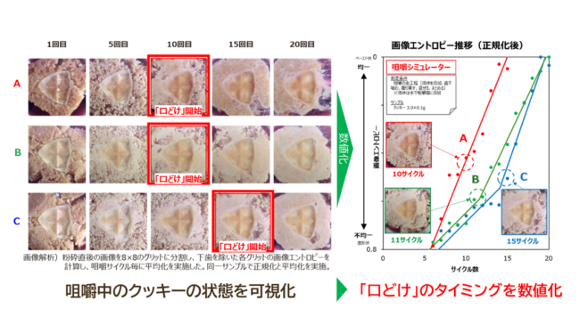 Aのクッキーは咀嚼を数回繰り返した段階からペースト化する様子が見られました。続いてB、Cの順にペースト化のタイミングが遅くなりました。画像エントロピーの推移からもA>B>Cの順にペースト化が進み、これが「口どけ」の始まるタイミングと関連すると考えられます。