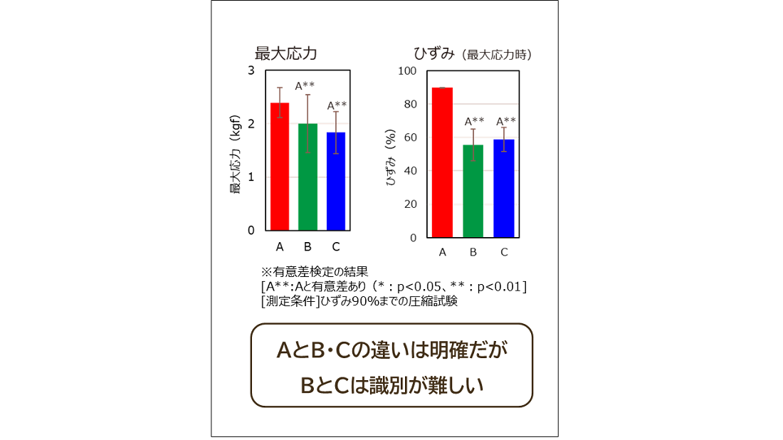 まず従来の力学分析(単回圧縮試験)を行ったところ、AとB・Cの間には明確な違いが見られましたが、BとCの識別は困難でした。力学分析では、BとCの「口どけ」の違いを判別できなかったのです。