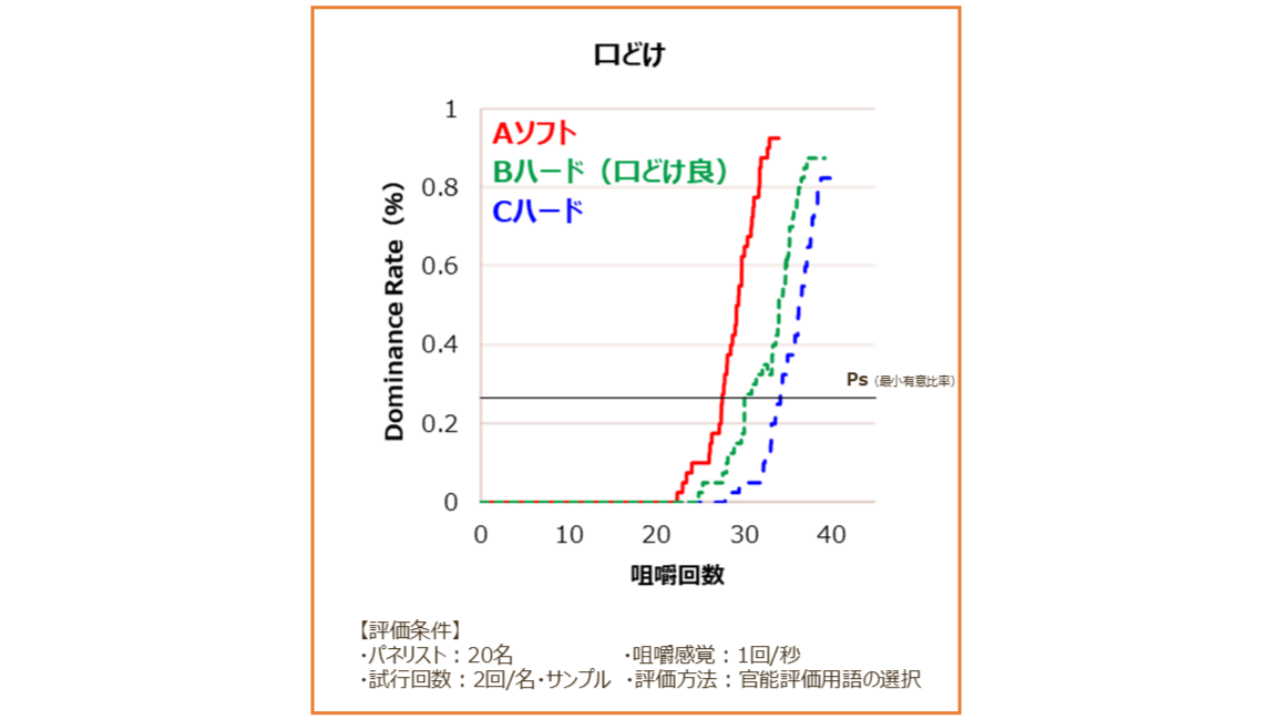 咀嚼シミュレーターと官能評価による結果を比較すると、A>B>Cの順で「口どけ」の進行が一致しており、官能評価との対応関係が確認されました。
