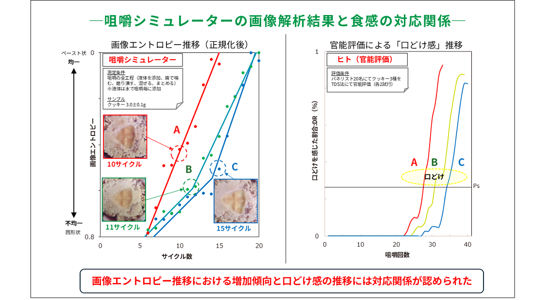 Aのクッキーは咀嚼を数回繰り返した段階からペースト化する様子が見られました。続いてB、Cの順にペースト化のタイミングが遅くなりました。画像エントロピーの推移からもA>B>Cの順にペースト化が進み、これが「口どけ」の始まるタイミングと関連すると考えられます。